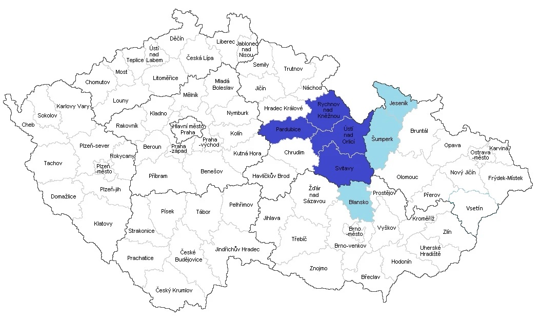 Modře jsou vyznačeny okresy, ve kterých se během roku pohybuji. Tmavě modře regiony, kde se pohybuji nejčastěji. Domovským okresem jsou Svitavy.